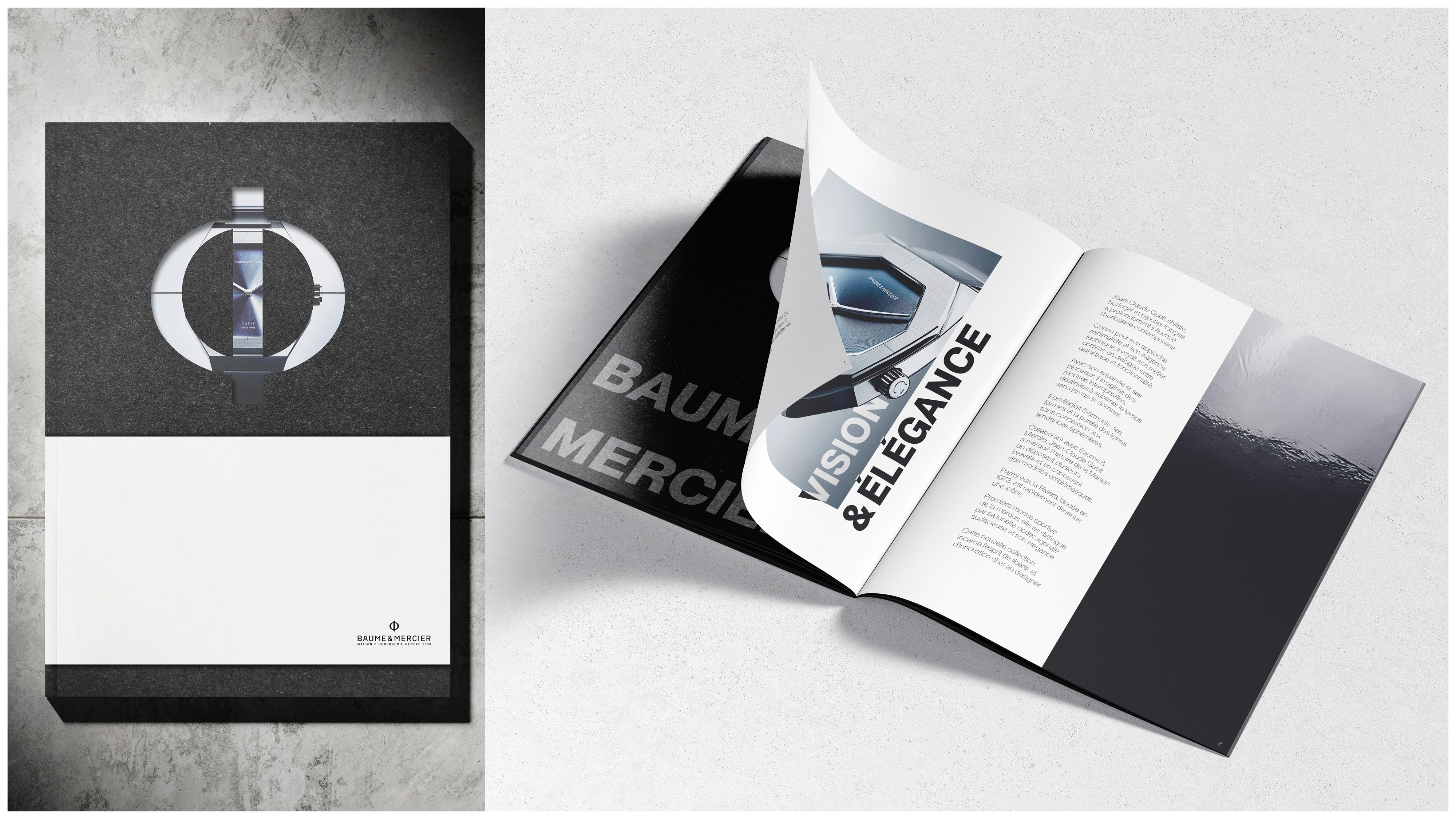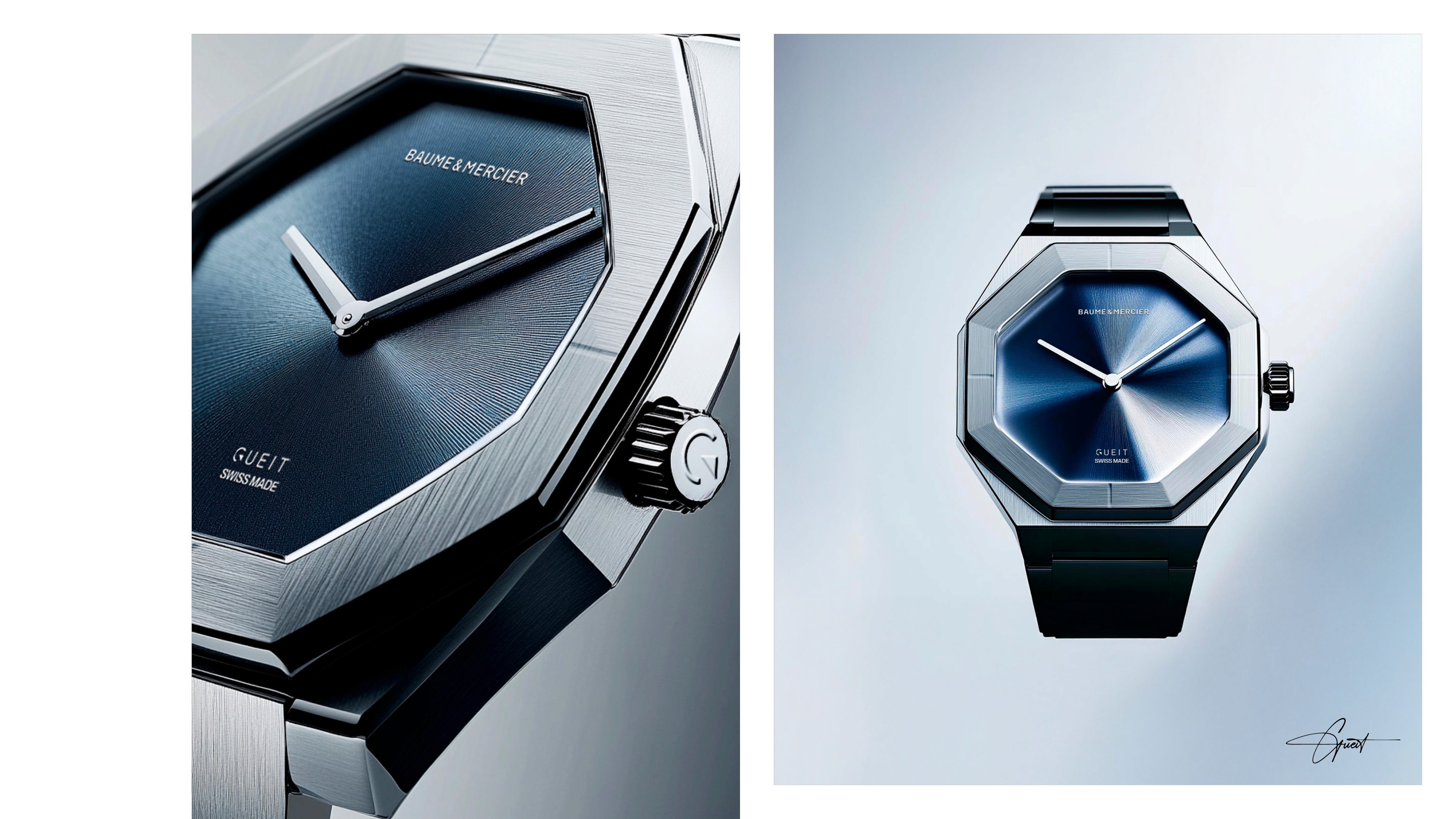 For this project, we developed the visual identity for Baume & Mercier's Gueit model, blending luxury with contemporary design. A booklet was created to accompany the watch, and we also designed the concept for the product reveal event, an exhibition honoring Jean-Claude Gueit, creator of the iconic Riviera model, at the International Watchmaking Museum in La Chaux-de-Fonds, Switzerland, celebrating his legacy in Swiss luxury watchmaking. This project features AI-generated visuals created with Midjourney.