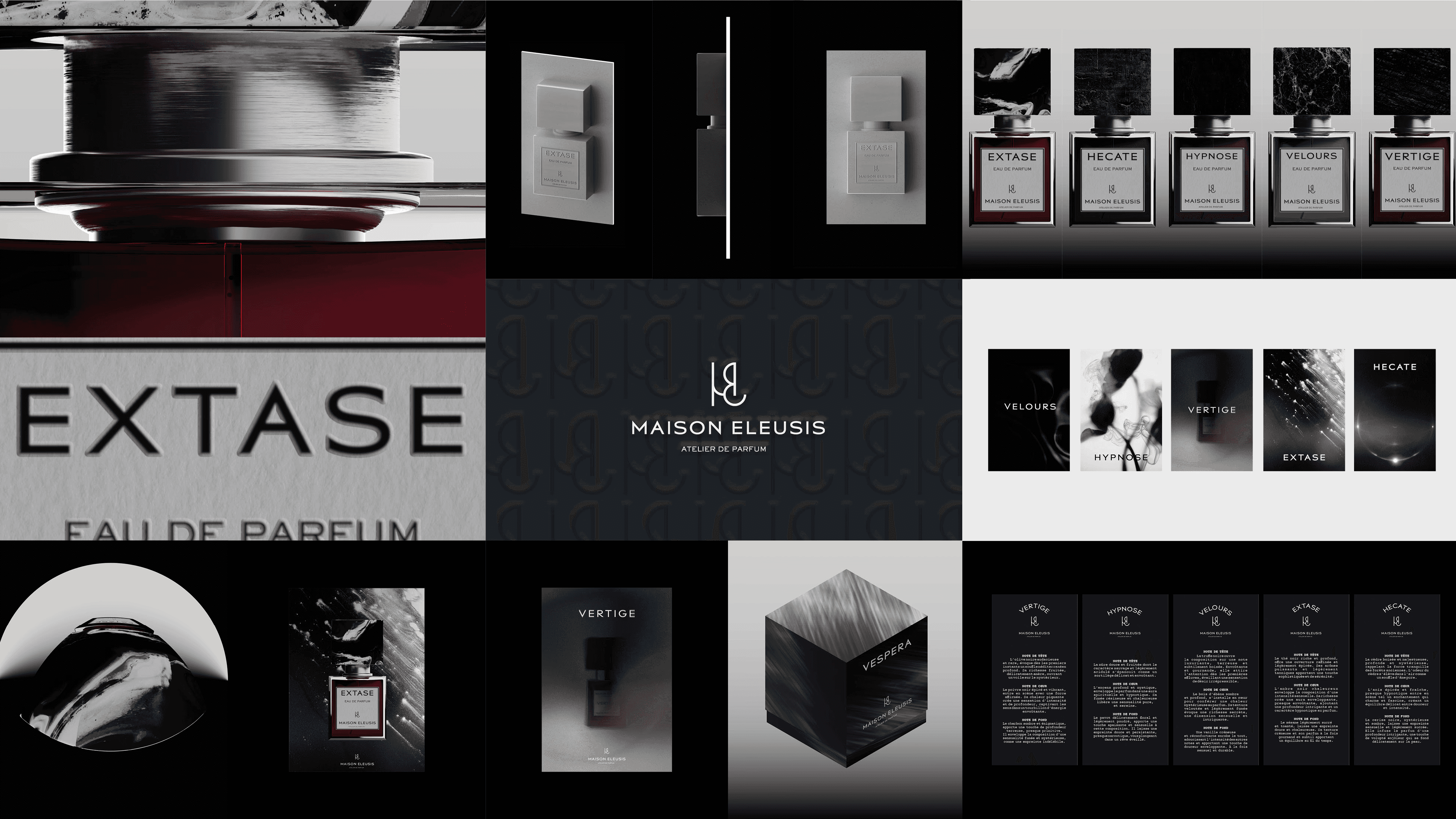 Maison Eleusis, a luxury perfume project, required a refined visual identity. I designed the brand direction, product visuals, and 3D renderings, combining lighting, materials, and motion to create a strong sensory aesthetic.